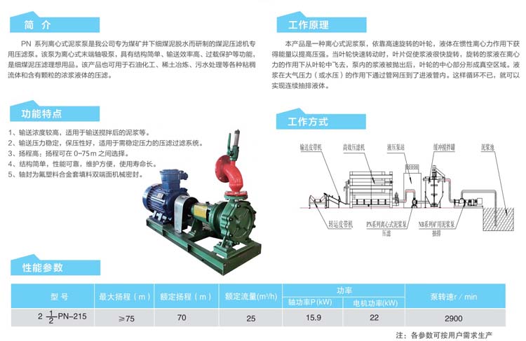 PN系列离心式泥浆泵是我公司专为煤矿井下细煤泥脱水而研制的煤泥压滤机压滤泵。该泵为离心式末端轴吸泵,具有结构简单、过载保护等功能,是细煤泥压滤理想用品。该产品也可用于石油化工、稀土冶炼、污水处理等各种粘稠流体和含有颗粒的浓浆液体的压滤。
