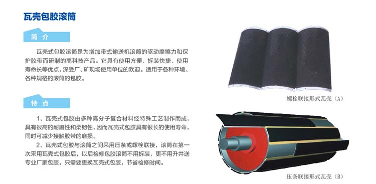 1、瓦壳式包胶由多种高分子复合材料经特殊工艺制作而成,具有柔韧性,因而瓦壳式包胶具有很长的使用寿命,同时可减少接触胶带的磨损。